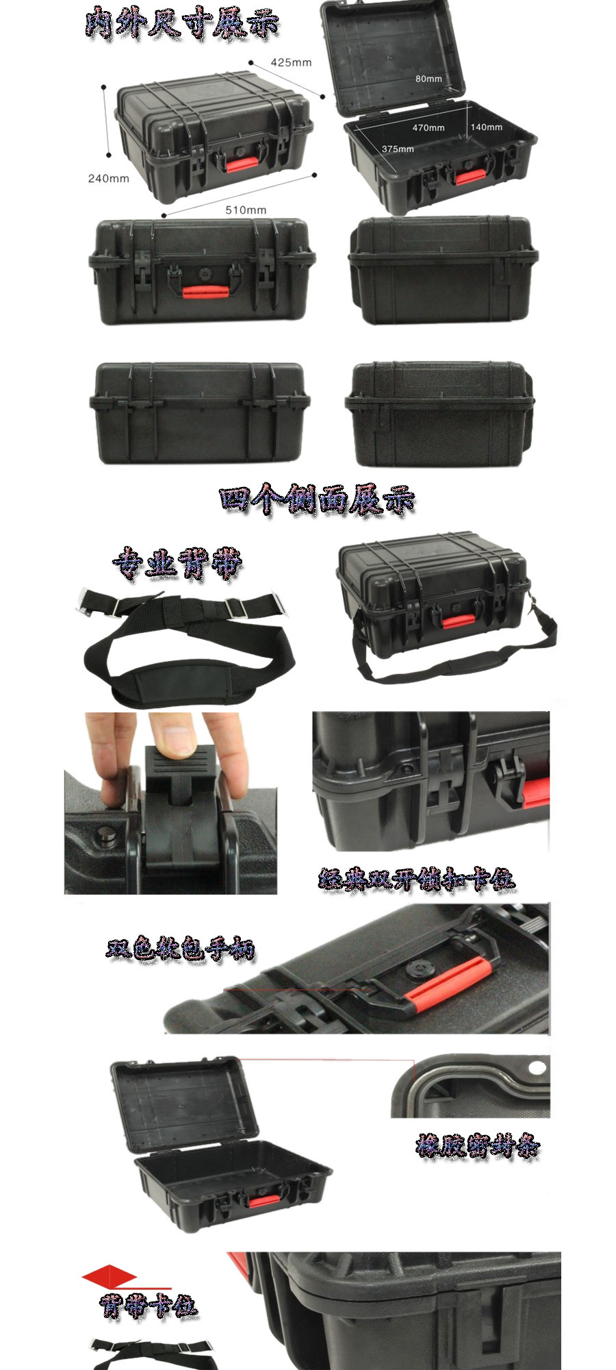 簡要說明:廣泛用于傳媒、公安、消防、軍隊、航空、戶外攝影、野外考察、科學(xué)探測等眾多領(lǐng)域的高端儀器、儀表。具有高強度、高抗壓沖擊、防潮、絕對密封、防塵、防水等特點。產(chǎn)品材質(zhì):ABS原料,箱體采用高抗沖擊的高分子聚合材料一體注塑成型,密封采用扁型彈性發(fā)泡密封橡膠條,確保防水氣密,所有較軸均采用不銹鋼材質(zhì)。