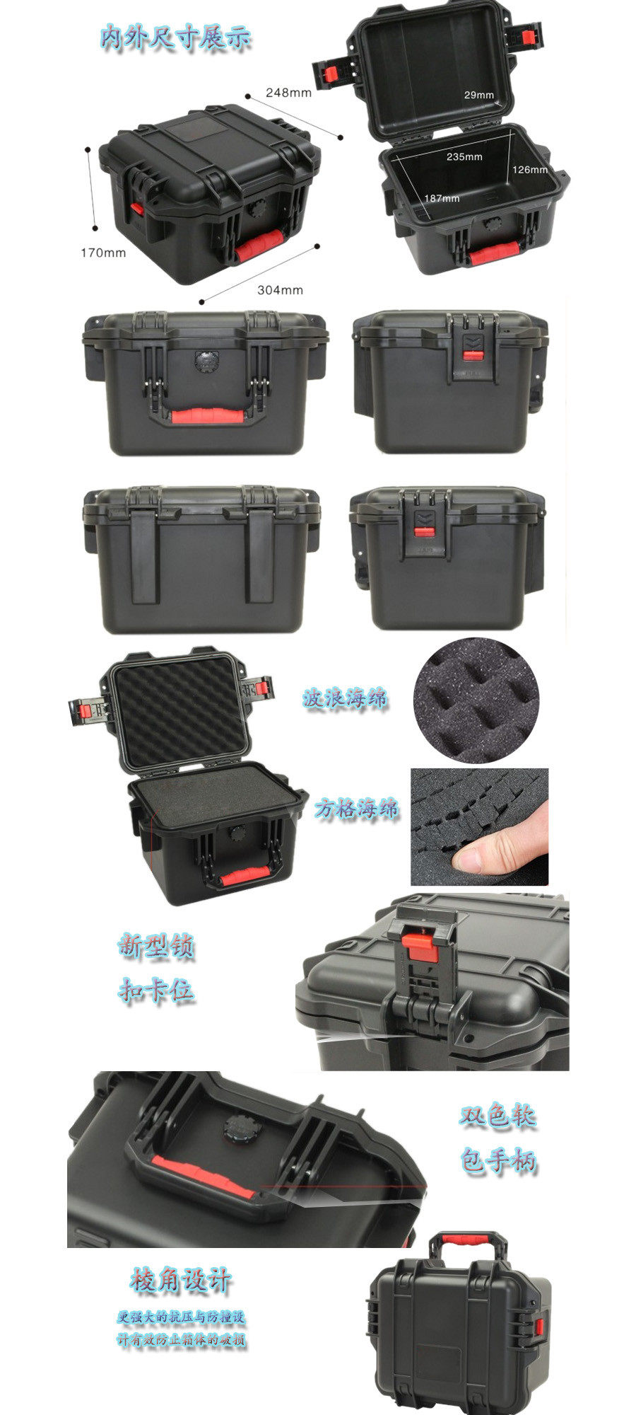 簡(jiǎn)要說(shuō)明:廣泛用于傳媒、公安、消防、軍隊(duì)、航空、戶外攝影、野外考察、科學(xué)探測(cè)等眾多領(lǐng)域的高端儀器、儀表。具有高強(qiáng)度、高抗壓沖擊、防潮、絕對(duì)密封、防塵、防水等特點(diǎn)。產(chǎn)品材質(zhì):ABS原料,箱體采用高抗沖擊的高分子聚合材料一體注塑成型,密封采用扁型彈性發(fā)泡密封橡膠條,確保防水氣密,所有較軸均采用不銹鋼材質(zhì)。