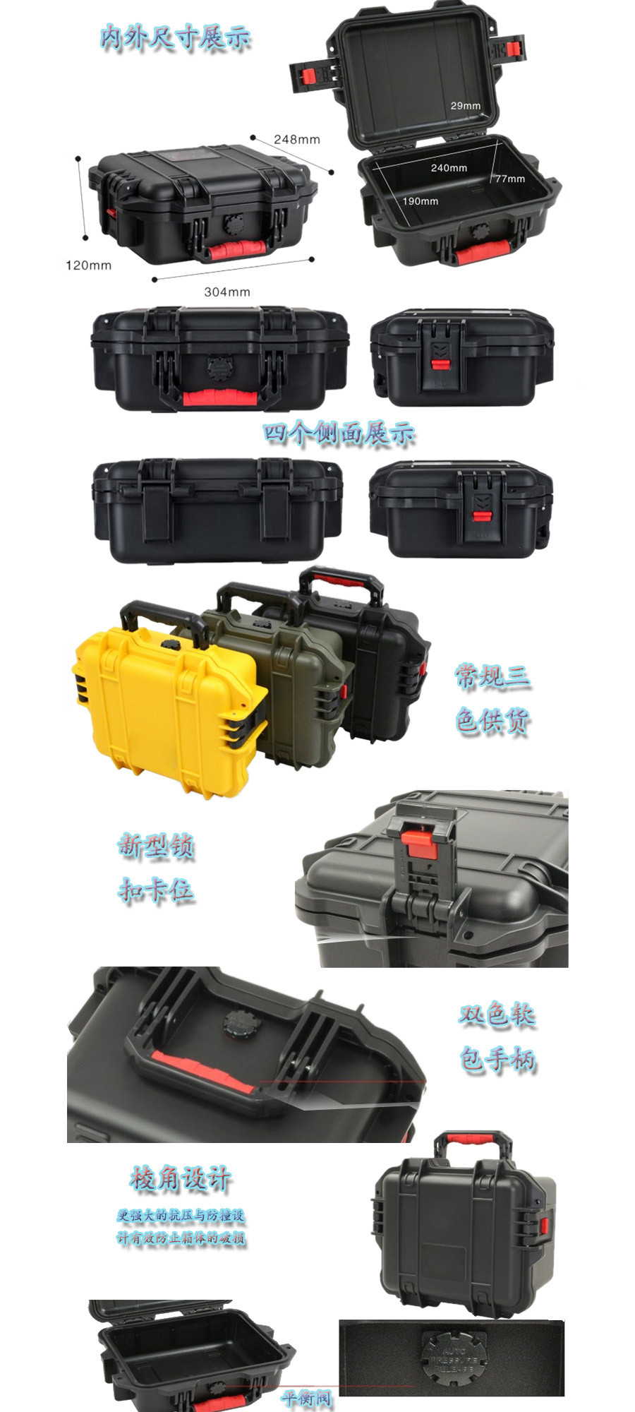 簡要說明:廣泛用于傳媒、公安、消防、軍隊、航空、戶外攝影、野外考察、科學(xué)探測等眾多領(lǐng)域的高端儀器、儀表。具有高強(qiáng)度、高抗壓沖擊、防潮、絕對密封、防塵、防水等特點。產(chǎn)品材質(zhì):ABS原料,箱體采用高抗沖擊的高分子聚合材料一體注塑成型,密封采用扁型彈性發(fā)泡密封橡膠條,確保防水氣密,所有較軸均采用不銹鋼材質(zhì)。